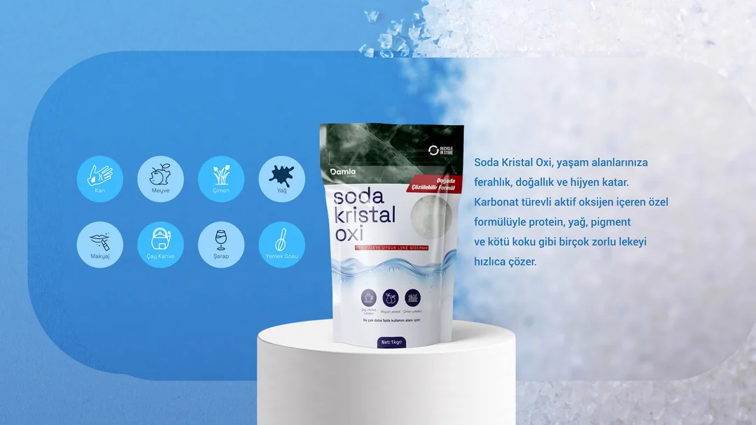 Soğuk suyla ıslattığınız lekenin üzerine bir miktar Soda Kristal Oxi serpin.