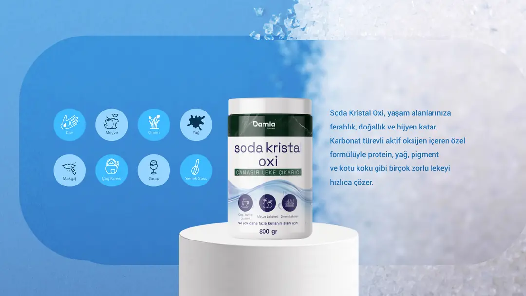 Soğuk suyla ıslattığınız lekenin üzerine bir miktar Soda Kristal Oxi serpin.
